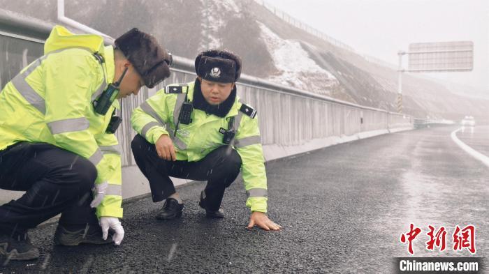 圖為交警查看路面結冰情況。(西安公安交警高交大隊供圖)