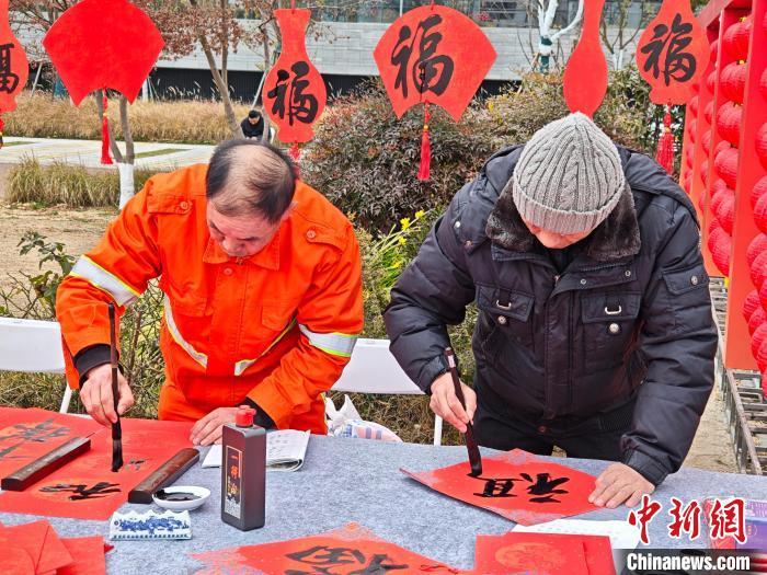 活動(dòng)現(xiàn)場(chǎng)還安排了游園會(huì),包括“投福”(投壺)、暴“富”(吹爆氣球)等趣味游戲和傳統(tǒng)文化體驗(yàn)攤位。來自上城區(qū)文化館的書法老師也寫了福字、春聯(lián),贈(zèng)送給環(huán)衛(wèi)工人和周邊過往民眾,為活動(dòng)增添墨香年味。