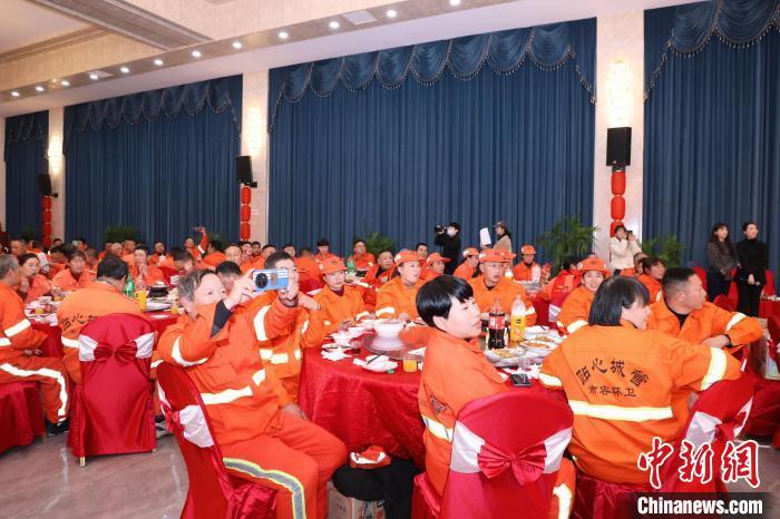 西湖區(qū)的環(huán)衛(wèi)工人共享年夜飯。 杭州市城管局供圖