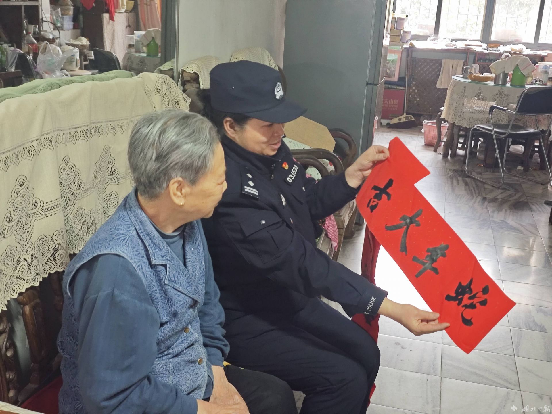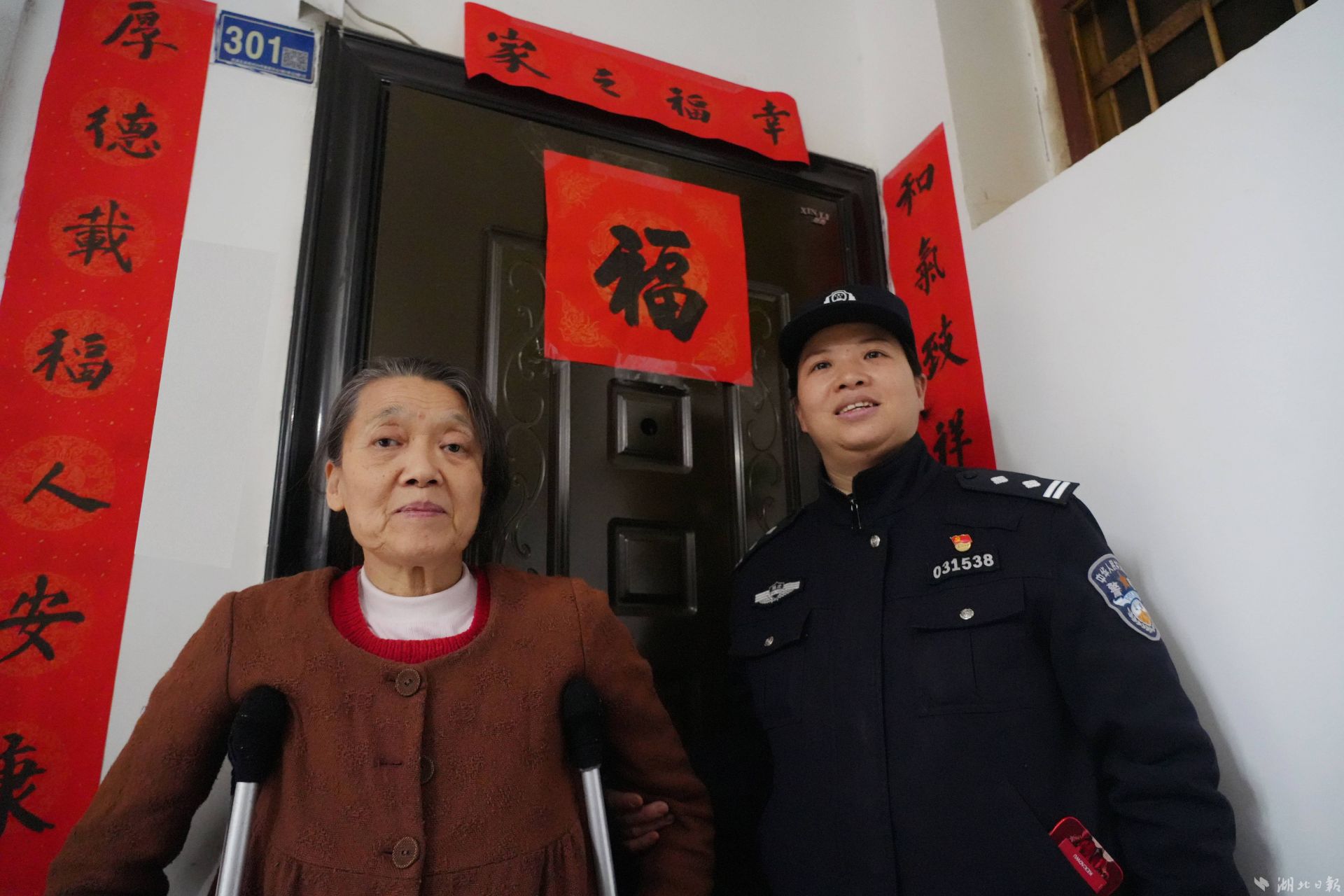 荊楚網(湖北日報網)訊(記者 白云 通訊員 董興龍、薛謖)“祝您春節快樂,身體健康,我來幫您貼上‘?!帧!?月24日上午,在武漢市武昌區水果湖街道洪山路社區,社區民警全凌雅專程上門看望轄區困難家庭和獨居老人,為他們送去過年物資和新春祝福。