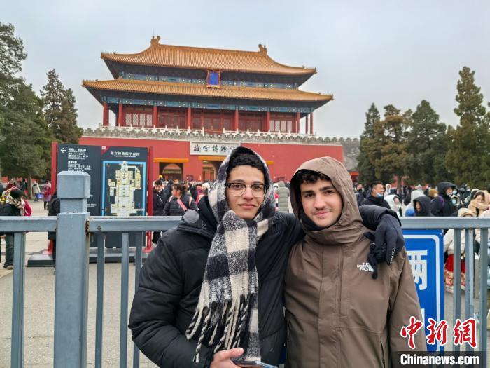 1月26日,在故宮博物院神武門前,西班牙游客奧勒(左)與好友合影留念。中新社記者 劉玥晴 攝