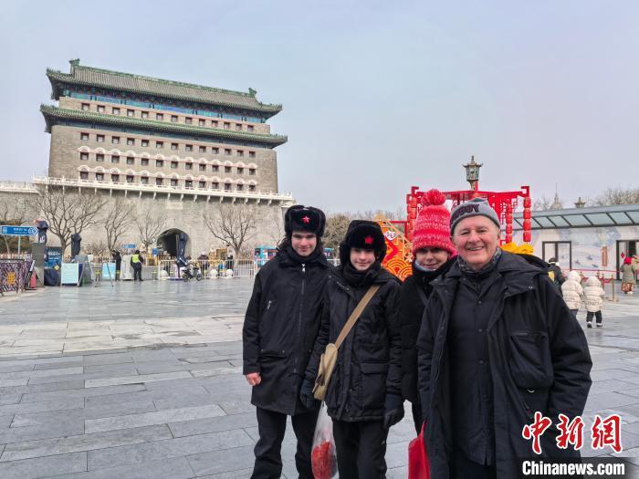 1月26日,在正陽門箭樓前,波蘭高中生斯坦尼斯拉夫(左一)與家人合影留念。中新社記者 劉玥晴 攝