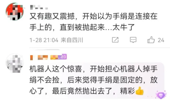 有網友問,機器人飛手絹真沒想到,太震撼了,是不是綁了繩子?