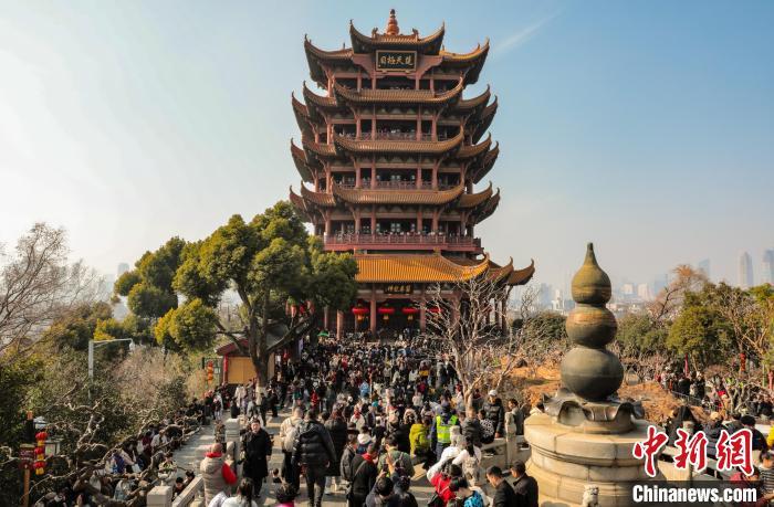 1月29日,農歷正月初一,武漢黃鶴樓公園游客眾多。八方游客登黃鶴樓過幸福吉祥年。圖為游客登黃鶴樓游玩參觀。中新社記者 張暢 攝