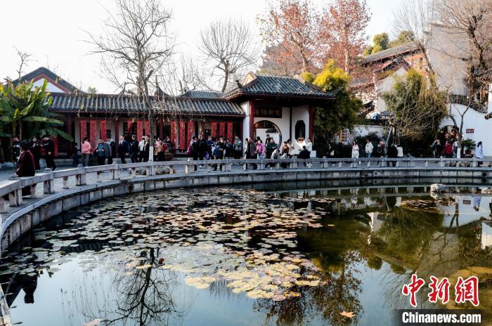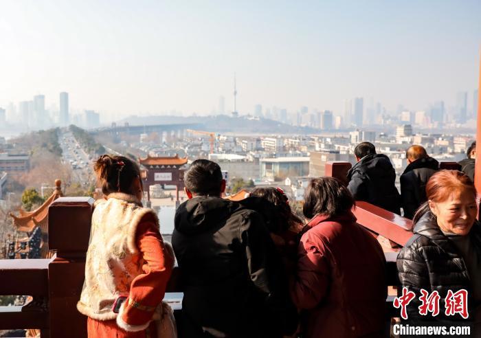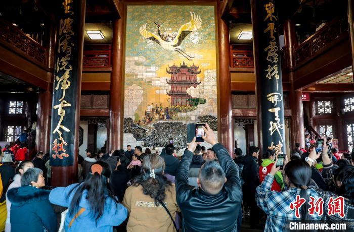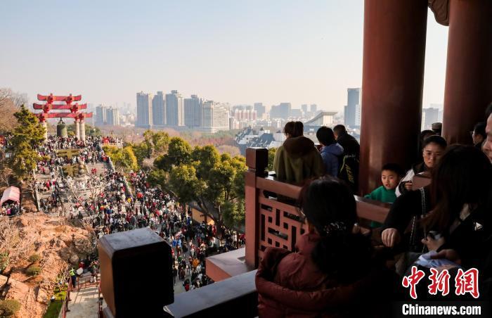 1月29日,農歷正月初一,武漢黃鶴樓公園游客眾多。八方游客登黃鶴樓過幸福吉祥年。圖為游客在黃鶴樓公園游玩參觀。中新社記者 張暢 攝