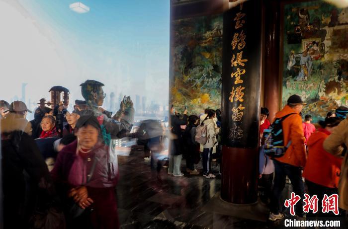 1月29日,農歷正月初一,武漢黃鶴樓公園游客眾多。八方游客登黃鶴樓過幸福吉祥年。圖為游客在黃鶴樓游玩參觀。中新社記者 張暢 攝