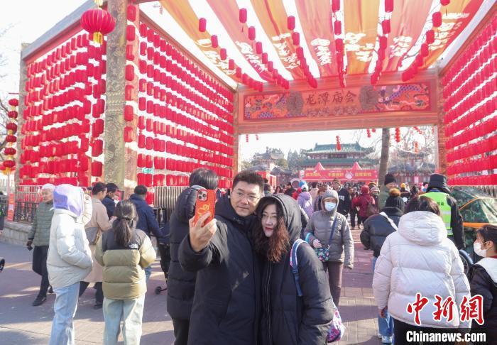 1月29日大年初一,第三十九屆北京龍潭春節文化廟會正式啟幕。圖為游客在廟會門前自拍。 中新社記者 賈天勇 攝