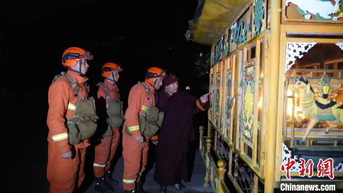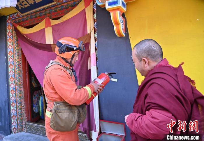 白春和隊友們在康定寺廟開展防火巡查。韓亞偉 攝