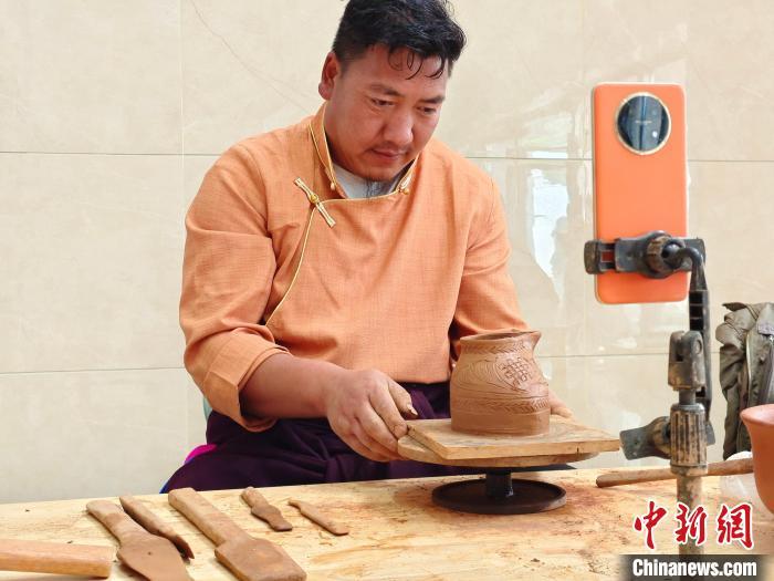 2024年5月29日,香格里拉市一位藏族黑陶匠人用直播平臺展示黑陶制作技藝。 中新社記者 韓帥南 攝