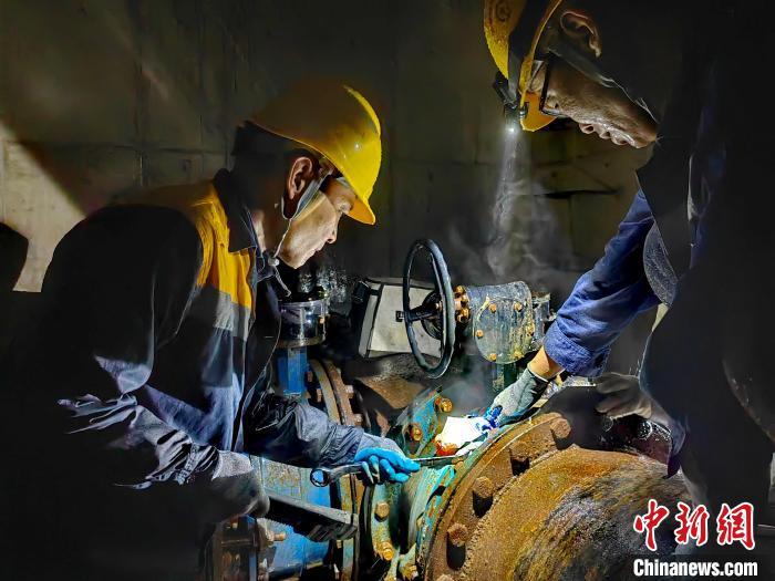火車從軌道上呼嘯而過,“供水俠”在軌道下熱火朝天。DN500管道閥門換膠圈是個大工程,他們拿起工具快速地對連接處的螺栓進行拆卸,碰到卡死的螺栓,就用鋸子鋸、用切割機切、用扁鏨子振。霎時間,金屬的碰撞聲在管道內(nèi)不斷響徹、回蕩。