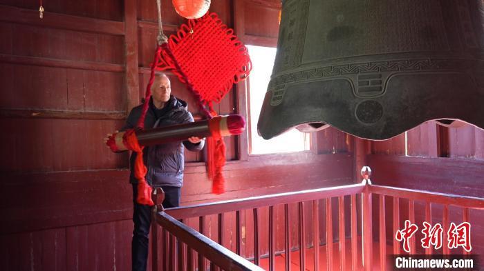 春節(jié)期間,英國游客威廉在寧波保國寺敲鐘祈福。 朱海升 攝