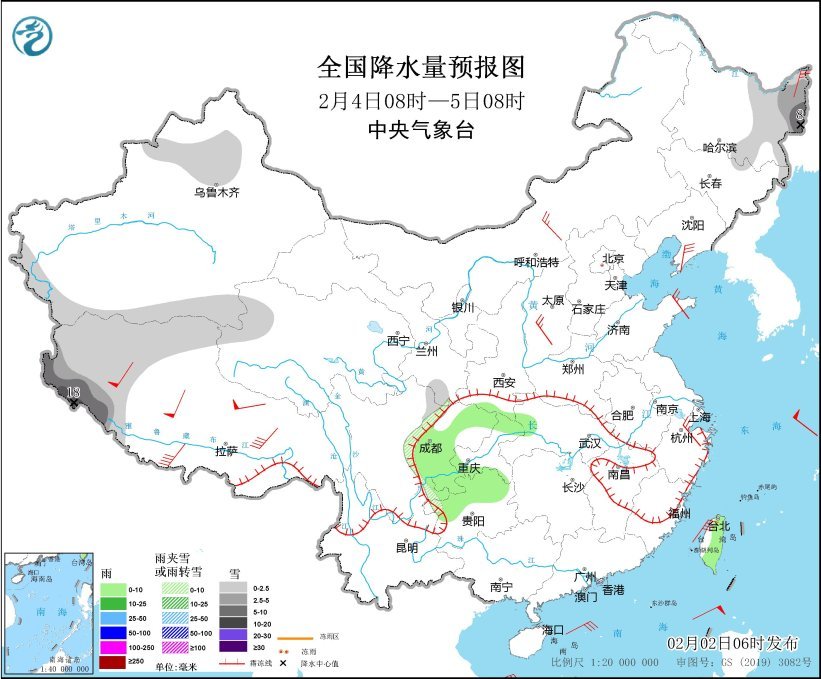 2月4日08時至5日08時,新疆沿天山地區和南疆高海拔山區、西藏西部、青海西部、黑龍江東部等地部分地區有小中雪或雨夾雪,其中,黑龍江東部、西藏西南部等地局地有大到暴雪(10~18毫米)。四川盆地中東部和西部、貴州北部、臺灣島大部等地部分地區有小雨。西藏大部、內蒙古中部、華北西部、遼東半島、山東半島、浙江北部等地部分地區有4~7級風,其中,西藏北部和西部等地部分地區有7~8級風(見圖3)。