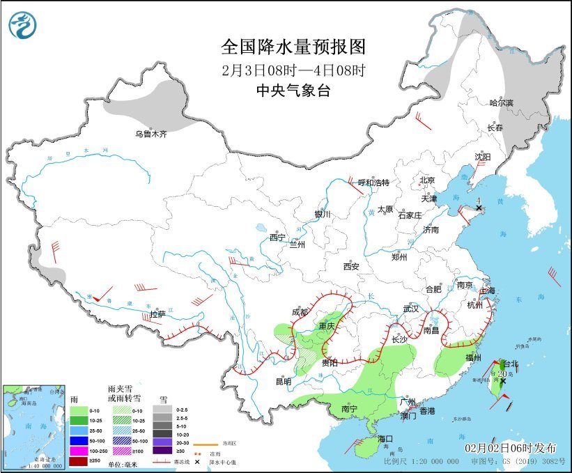 圖2 全國降水量預報圖(2月3日08時-4日08時)