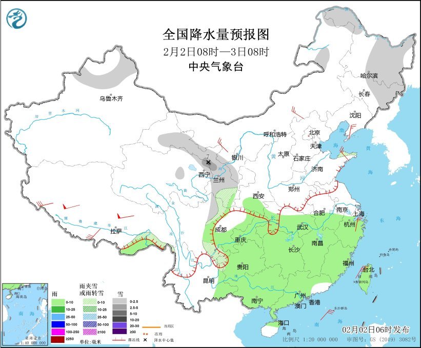 圖1 全國降水量預報圖(2月2日08時-3日08時)