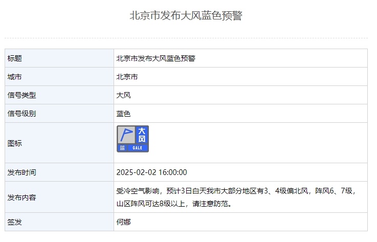 中新網2月2日電 據北京氣象局網站消息,受冷空氣影響,預計3日白天北京市大部分地區有3、4級偏北風,陣風6、7級,山區陣風可達8級以上,請注意防范。