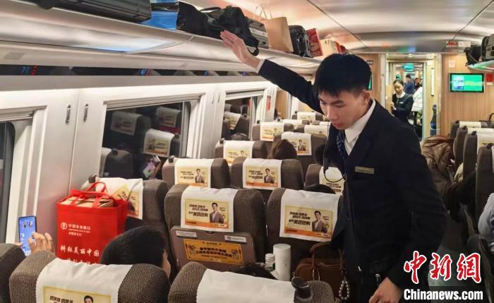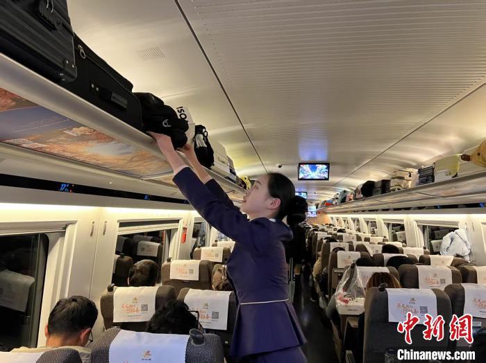 7時15分,列車從上海虹橋車站緩緩駛出。陳晶晶來到車廂忙碌起來。她擺放著車門口的行李,讓它們既不擋路又能有序擺放。“這不光是個力氣活,還是個技術(shù)活。”只見陳晶晶幾下擺弄,原本外溢到通道的行李很快被摞到一起。