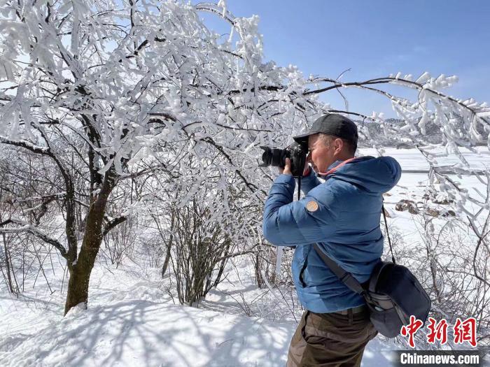 章叔巖向作者展示了一張他拍到的梅花鹿照片,白雪覆蓋的森林里,兩只梅花鹿相對站立,同時回頭看向鏡頭。