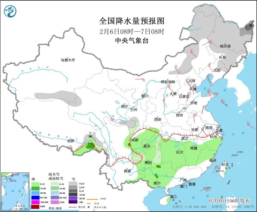 全國降水量預(yù)報圖(2月5日08時-6日08時)