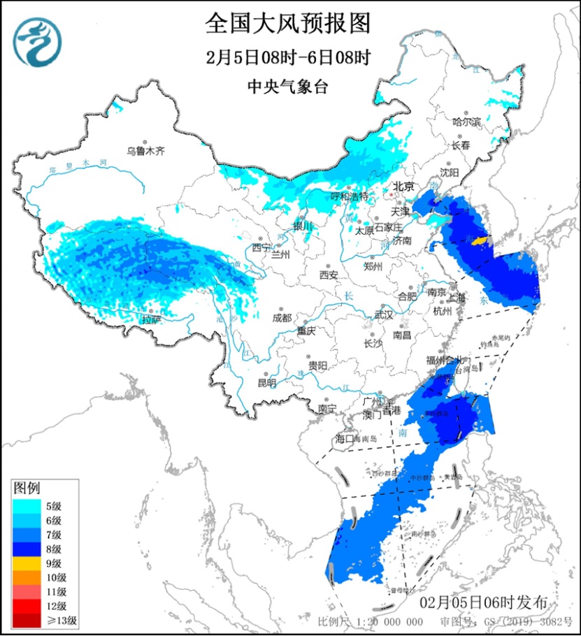 6日起,新一股強冷空氣將再度自北向南影響中東部,帶來大風降溫天氣,黃淮及其以北大部降溫6~8℃,其中西北地區(qū)東部、華北和黃淮的部分地區(qū)降溫幅度達10℃以上,南方大部降溫4~6℃,部分地區(qū)7~8℃;長江中下游以北地區(qū)伴有4~6級大風,陣風7~8級,其中,華北部分地區(qū)陣風9~10級,渤海及黃海北部有7~8級,陣風9~10級大風。中央氣象臺2月5日06時發(fā)布大風黃色預(yù)警:預(yù)計,2月5日08時至6日08時,西藏中北部、青海南部、內(nèi)蒙古中西部、華北北部等地部分地區(qū)有5~6級、陣風7~8級的大風,其中,西藏中北部、青海西南部的部分地區(qū)風力可達6~8級、陣風9~11級;渤海、渤海海峽、黃海大部海域、東海北部海域、臺灣海峽、巴士海峽、南海東部和西南部海域?qū)⒂?~8級、陣風9~10級的大風,其中黃海東南部的部分海域風力可達9級、陣風10級。