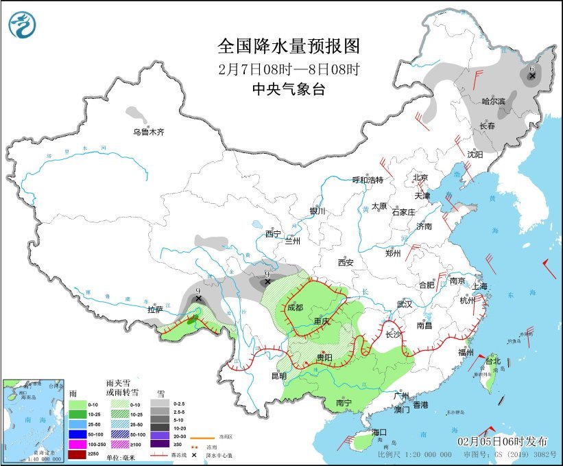 全國降水量預(yù)報圖(2月6日08時-7日08時)
