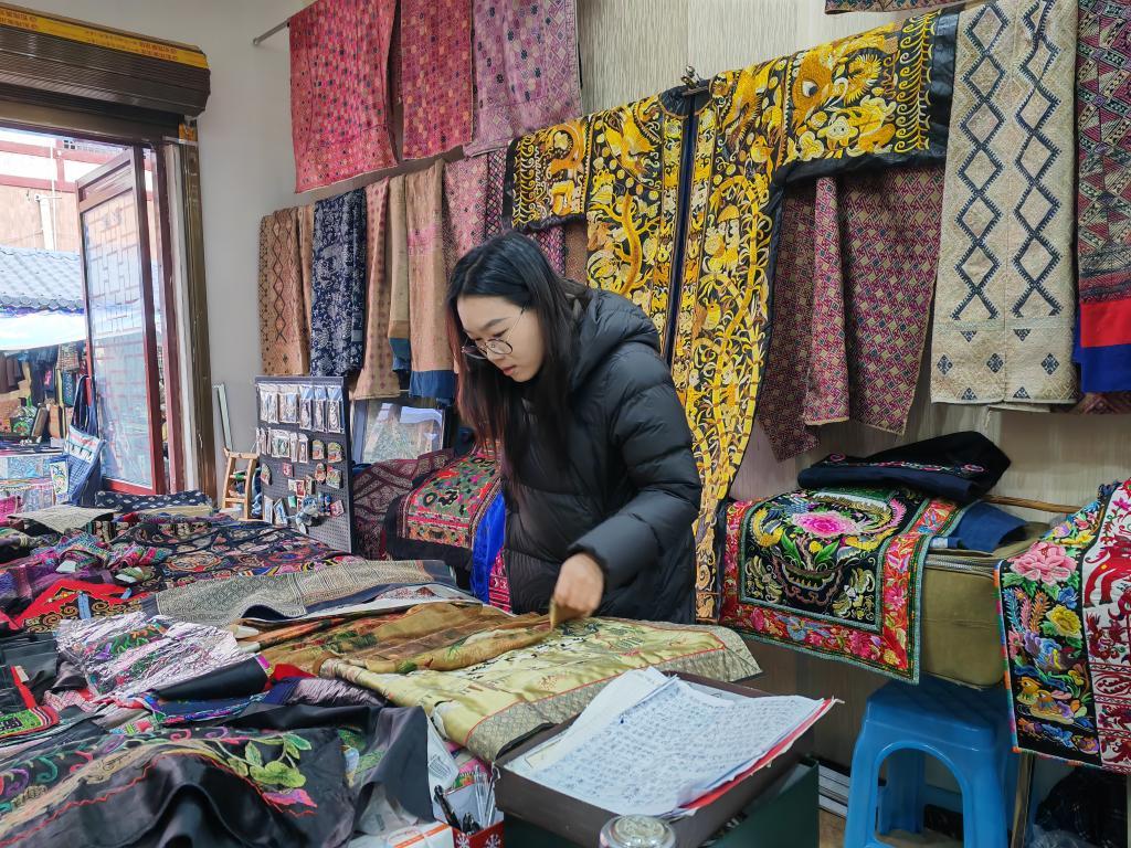 針對游客感興趣的繡品,潘玉珍總是耐心介紹紋樣的文化寓意,她希望游客帶走的不只是商品,更是背后深厚的民族文化。“我們的手工藝品受到國內外游客的認可和喜愛,這讓我很有信心。”潘玉珍自豪地說。