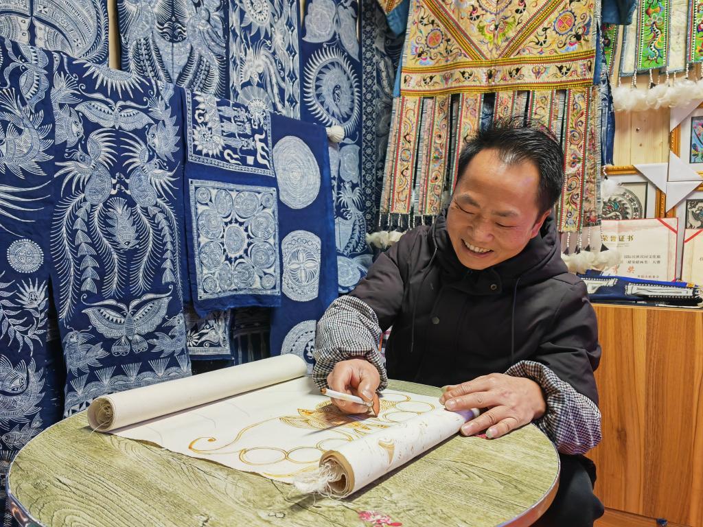 如今,在黔東南州凱里市苗侗風情園“非遺集市”一間10余平方米的店鋪里,他制作的蠟染作品被巧妙加工成衣服、包包、杯墊等產品,深受顧客喜愛。2024年,他的店鋪銷售額達15萬元。