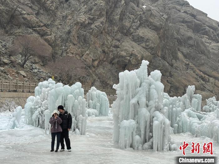 游客在賀蘭山巖畫景區內的冰瀑布景觀群打卡拍照。 中新網記者 李佩珊 攝