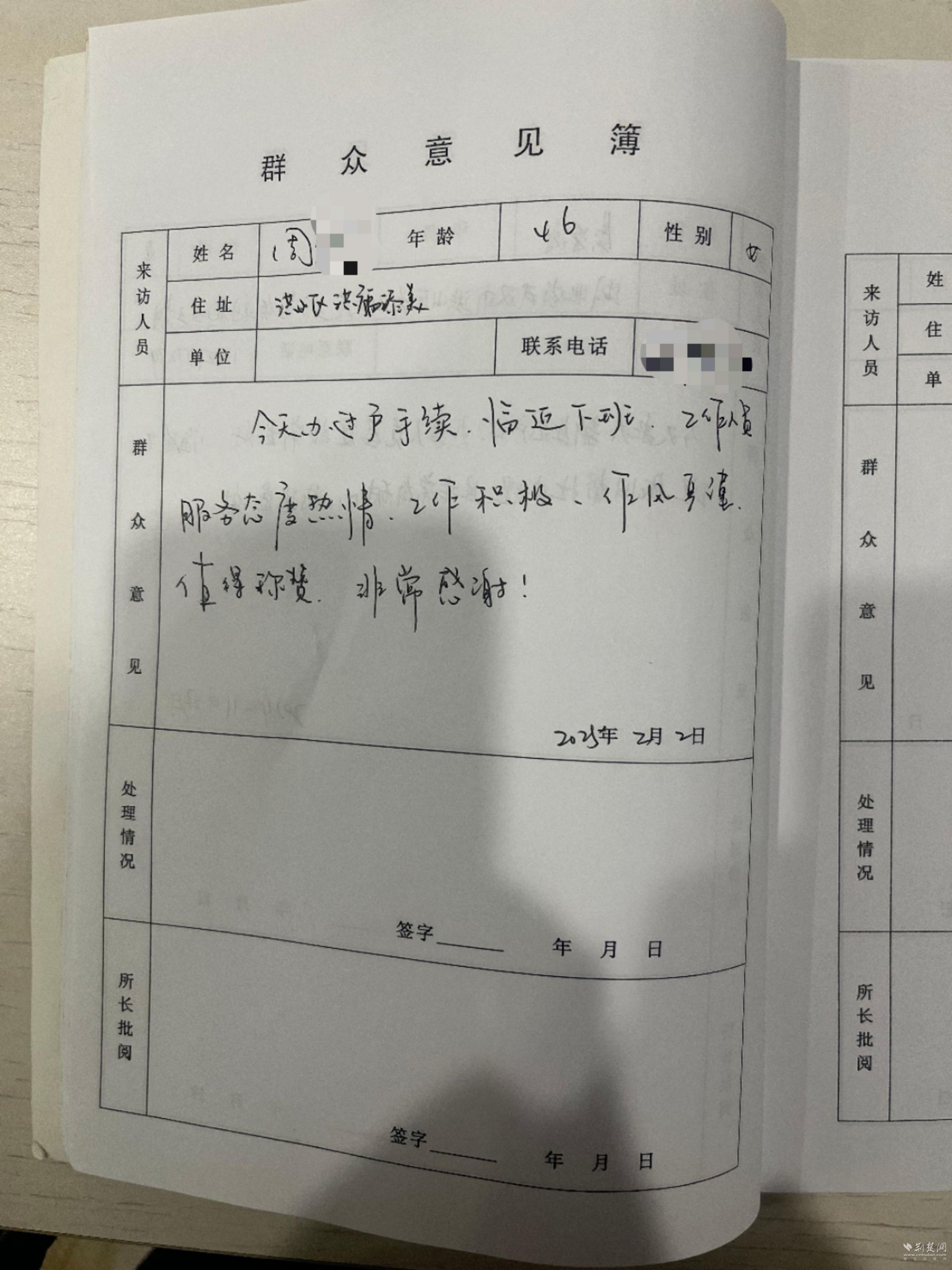 “我們想辦理戶口遷移,可沒注意時間,來晚了,還能辦嗎?”2月2日下午,洪山區分局關山派出所戶籍窗口剛剛結束當天的延時服務,一對夫妻帶著女兒來到窗口略帶歉意地問道。戶籍民警朱榮立即返回工作崗位重啟電腦,微笑著接過申請資料,有條不紊地為一家三口辦理戶口遷移手續。業務辦理完成后,夫妻二人感激不盡,在留言簿上寫下"工作人員態度熱情、工作積極、作風嚴謹,非常感謝!"