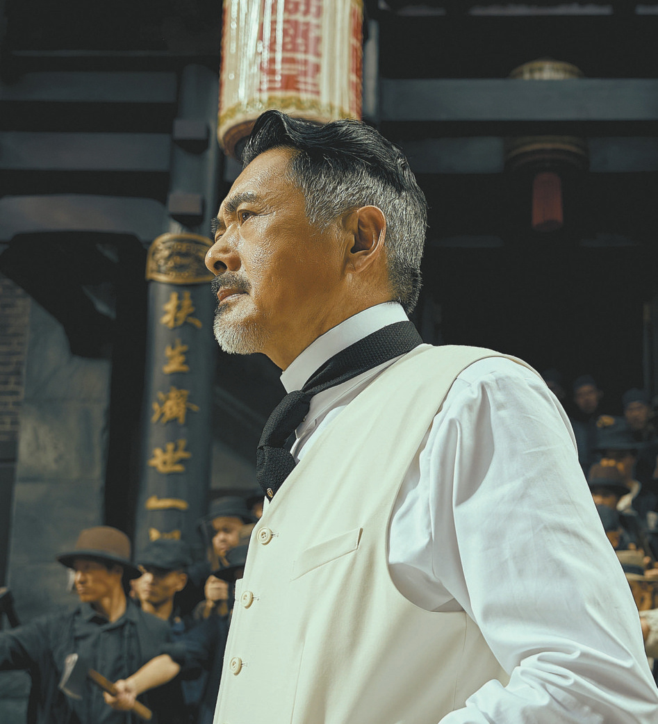 可以說《唐探1900》真正的主角,這次不是兩位偵探,而是白軒齡、白振邦父子,他們的經歷和立場在早期第一、第二代華人移民中具有代表性。周潤發飾演的白軒齡作為最早到舊金山的淘金者、修建太平洋鐵路的幸存者,可謂華工血淚史的書寫者和見證者。同時他又是復雜的,既有手腕又長袖善舞,黑白通吃,通過暴力和權錢交易自保,但也讓唐人街藏污納垢,連親兒子都難以忍受。而從他給兒子起名“振邦”來看,白軒齡內心也希望祖國一掃積貧積弱,海外僑民才能挺直腰桿,但他又不愿付出“拋頭顱灑熱血”的犧牲,只能深陷一種矛盾平衡之中。而白振邦(張新成 飾)、鄭仕良(白客 飾)等年輕一代,則選擇一腔熱血奔赴革命,同《十月圍城》《走向共和》里那樣“一代人去做一代人的事情”,成為全片最令人欽佩和振奮的群體。