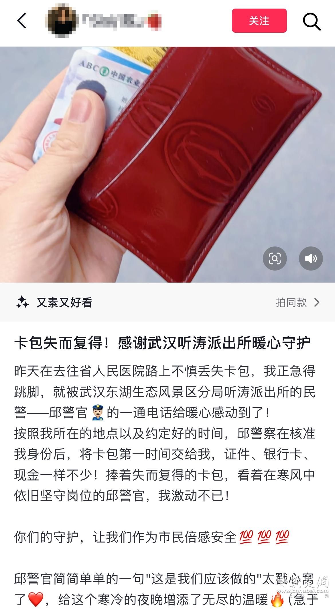 荊楚網(wǎng)(湖北日?qǐng)?bào)網(wǎng))訊(通訊員 蘇暢 杜鵬飛)“簡(jiǎn)簡(jiǎn)單單的一句‘這是我們應(yīng)該做的’太戳心窩了,給這個(gè)寒冷的夜晚增添了無盡的溫暖?!标惻浚ɑ拿窬袼掷锶』剡z失的證件卡包后,在她的自媒體賬號(hào)上寫下了長(zhǎng)長(zhǎng)一段感激的話語。