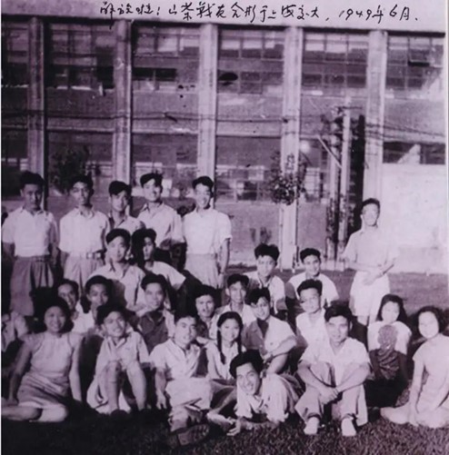 上海解放后,“山茶社”社員在上海交通大學校園合影,前排臥者為黃旭華。新華社發