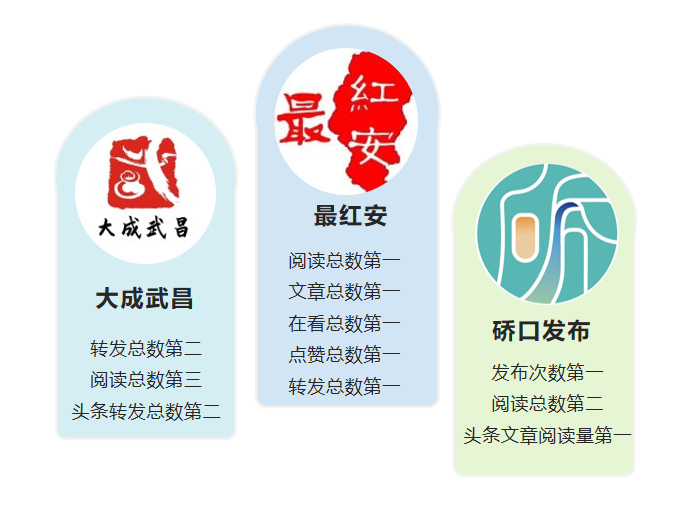 “最紅安”多項(xiàng)指標(biāo)位居第一,如文章總數(shù)、閱讀總數(shù)、在看總數(shù)、點(diǎn)贊總數(shù)、轉(zhuǎn)發(fā)總數(shù)等指標(biāo);“大成武昌”轉(zhuǎn)發(fā)總數(shù)第二、閱讀總數(shù)第三、頭條轉(zhuǎn)發(fā)總數(shù)第二,WCI指數(shù)排在第二位,二次傳播效果較好;“硚口發(fā)布”發(fā)布次數(shù)第一、閱讀總數(shù)第二、頭條文章閱讀量第一,WCI指數(shù)排在第三名。其他賬號(hào)部分單項(xiàng)指數(shù)亮點(diǎn)突出,“武漢經(jīng)開(kāi)區(qū)”最大閱讀數(shù)排名第一、“中國(guó)光谷”最大轉(zhuǎn)發(fā)數(shù)排名第一、“監(jiān)利教育”平均閱讀數(shù)排名第一。