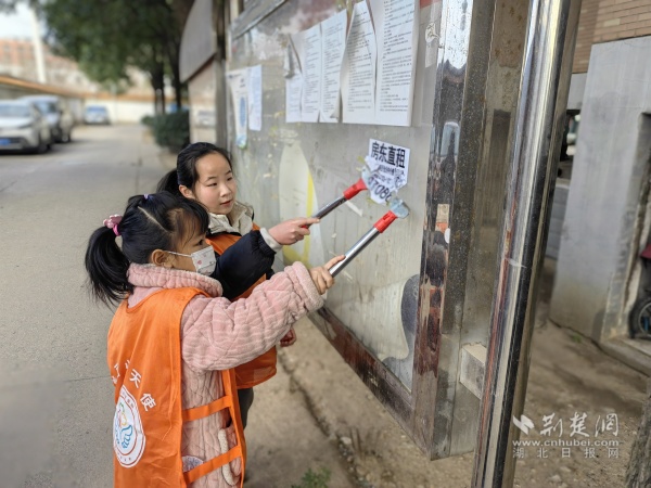 活動現場,工作人員為小志愿者們講解了安全注意事項和活動內容,并按年齡對孩子們進行了簡單分隊。孩子們熱情高漲,迫不及待地投入到志愿服務中。一隊小志愿者化身“環保小衛士”,手持鏟刀、噴壺等工具,認真清理著小區宣傳欄、樓道上的小廣告,不放過任何一個角落。經過一番努力,原本貼滿小廣告的宣傳欄煥然一新,露出了整潔的底色,孩子們的臉上也露出了自豪的笑容。