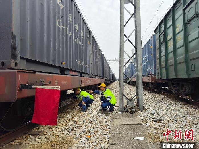 春運期間,株洲車輛段株北北運用車間站場股道間,檢車員檢查貨運列車。株洲車輛段供圖