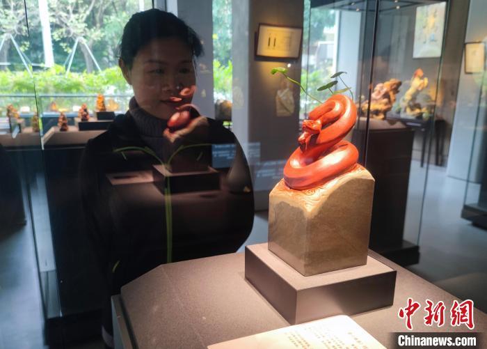 2月11日,“靈蛇舞春——壽山石雕藝術迎新展”在福州為新印鈕藝術館展出,吸引市民、游客前去參觀。馬洛 攝