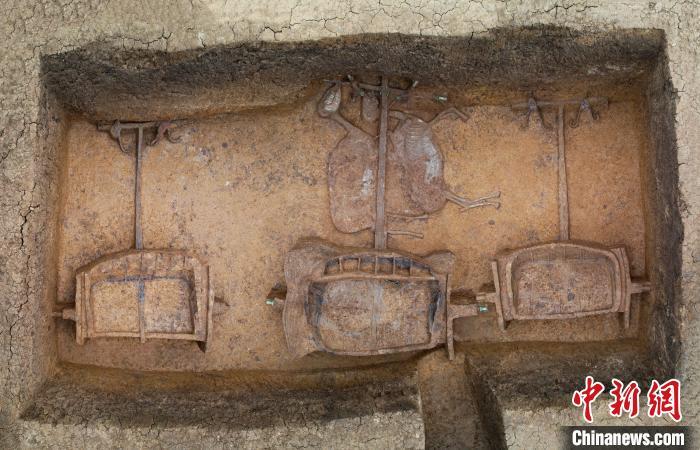 “此次發現的車馬埋葬形式,異于此前發現的楚國車馬埋葬方式?!焙鷦偨榻B,車轅與馬的前部被放置在壁龕中,車輪立于地面之上,以及存在有車無馬等埋葬現象,推斷墓主身份為元士,系比大夫低一級的地方官員。同時,發現的車馬均保存完好,為后期復原展示提供了條件。