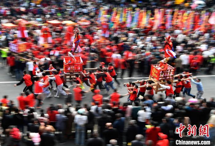 圖為2月11日,走古事隊伍在陸地競逐狂奔。 中新網記者 張斌 攝