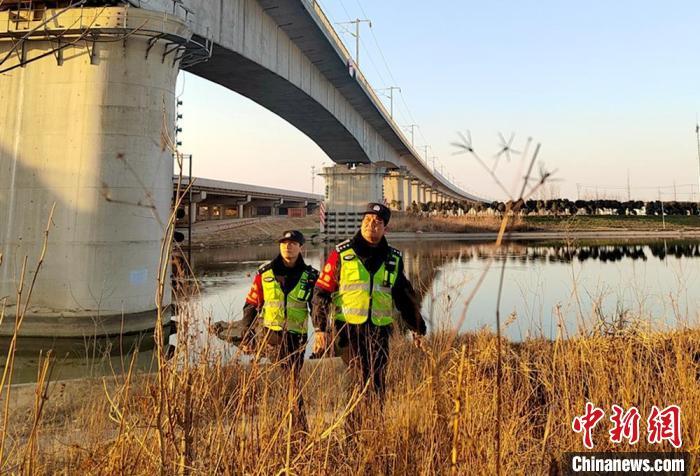 鐵警刁云武與葉嘉豪在南六塘河大橋下進行安全巡查。 朱志庚 攝