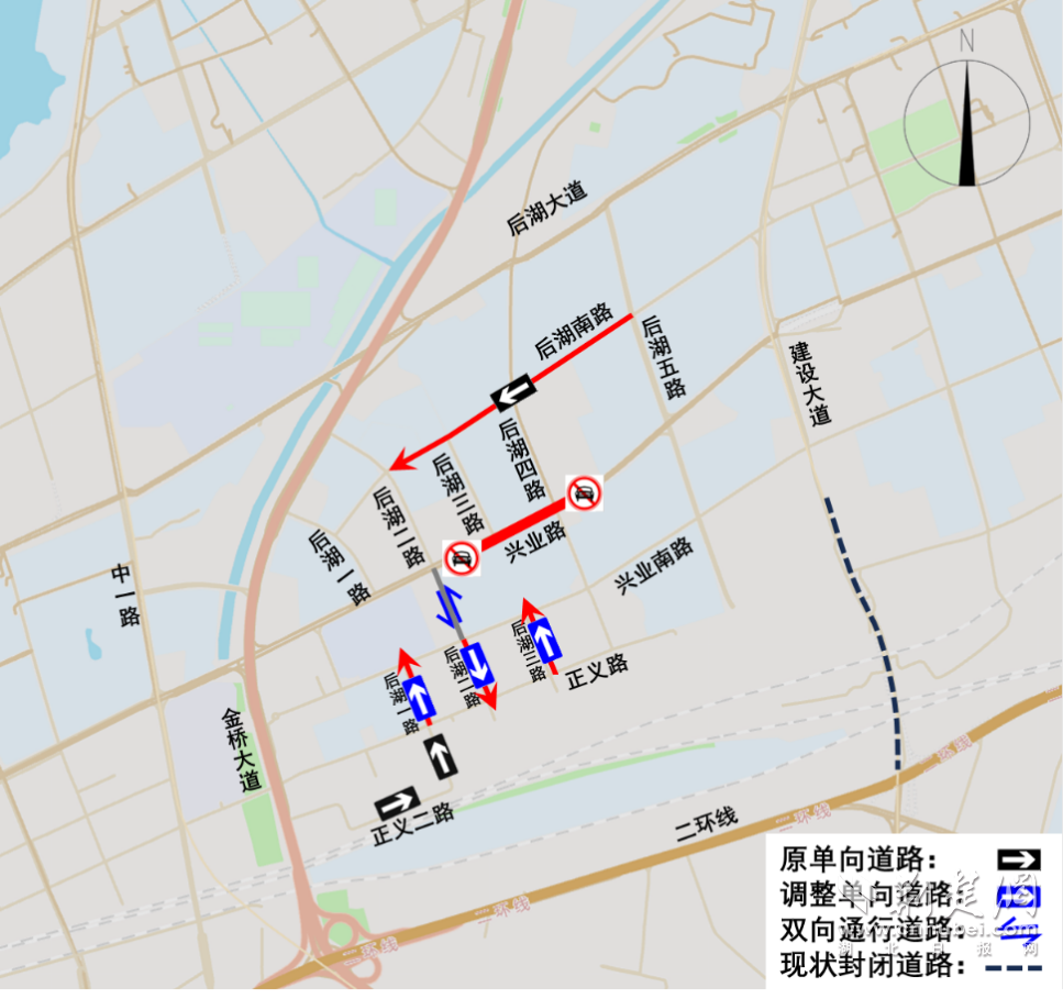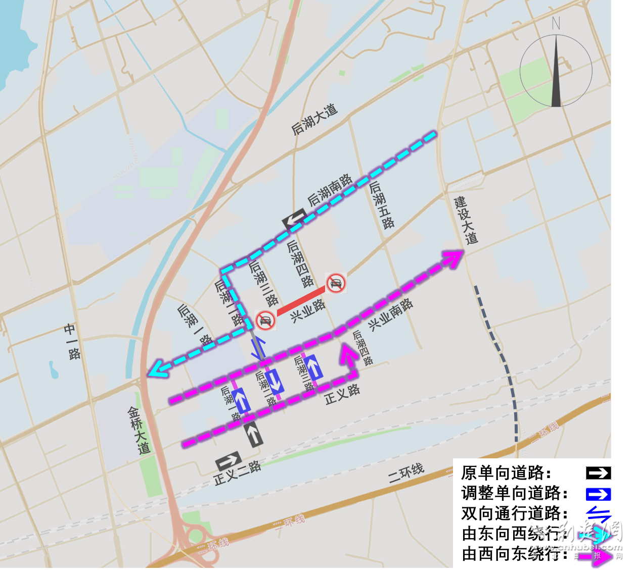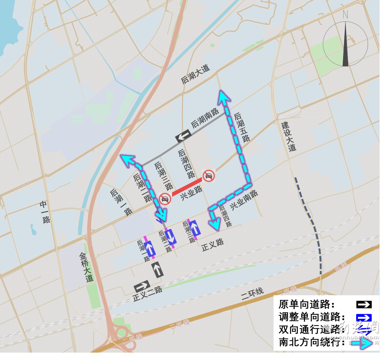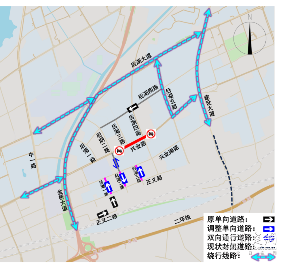 3.后湖二路(正義路至興業(yè)南路)實行機(jī)動車由北向南(興業(yè)南路往正義路方向)單向通行;后湖二路(興業(yè)路至興業(yè)南路)調(diào)整為雙向通行。