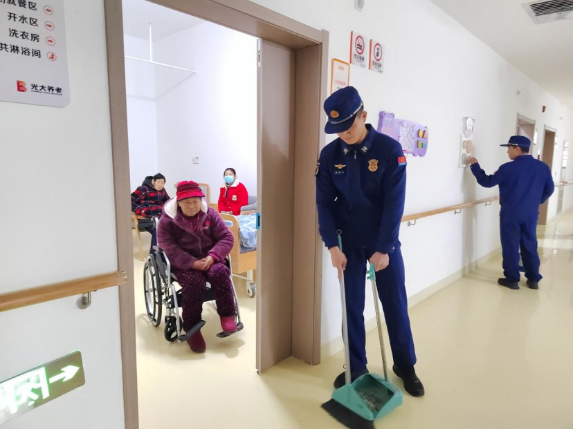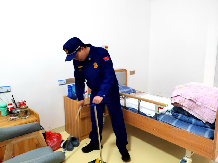 關懷與交流過后,消防員們紛紛挽起袖子,拿起掃帚、抹布等工具,投入到清潔工作中。他們仔細擦拭著桌椅,認真清掃地面。同時,還幫助老人們整理房間、歸置衣物,讓原本略顯凌亂的房間變得井井有條。