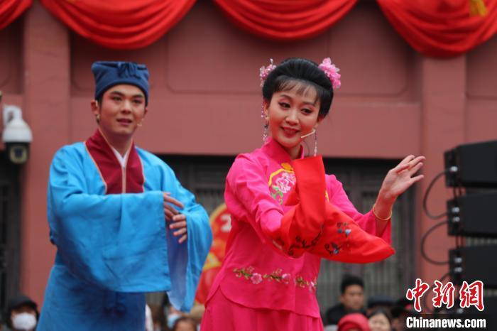 2月12日,黃梅戲演員在合肥市廬州府城隍廟大院內(nèi)表演黃梅戲經(jīng)典劇目《夫妻觀燈》。朱孔陽 攝