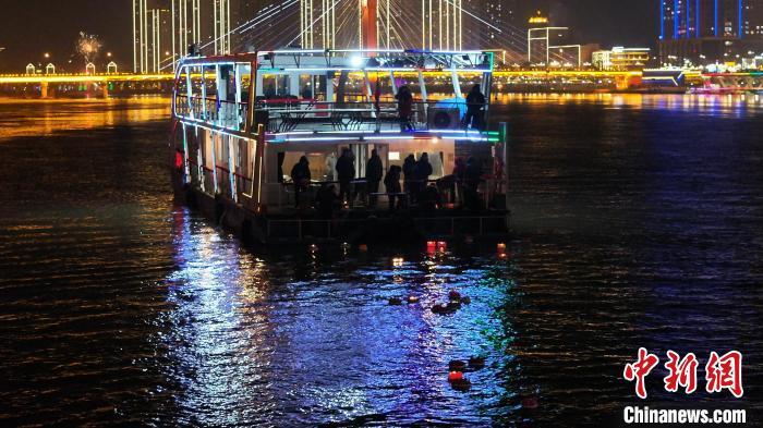市民及游客則站在江岸同時施放河燈。他們在河燈上寫上蛇年愿望,為新的一年祈福。除常規河燈外,十二生肖燈、百財燈等造型別致,象征著吉祥美好和財源廣進。