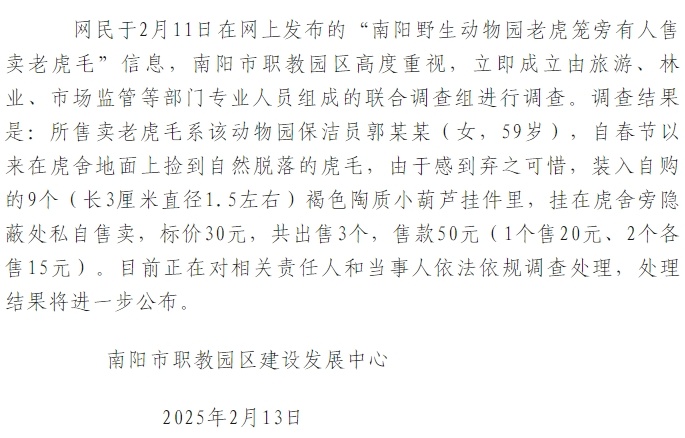 中新網2月13日電 據“南陽市職教園區網絡宣傳中心”微信公眾號消息,南陽市職教園區建設發展中心13日發布《關于“南陽野生動物園售賣老虎毛”的情況通報》稱,網民于2月11日在網上發布的“南陽野生動物園老虎籠旁有人售賣老虎毛”信息,南陽市職教園區高度重視,立即成立由旅游、林業、市場監管等部門專業人員組成的聯合調查組進行調查。
