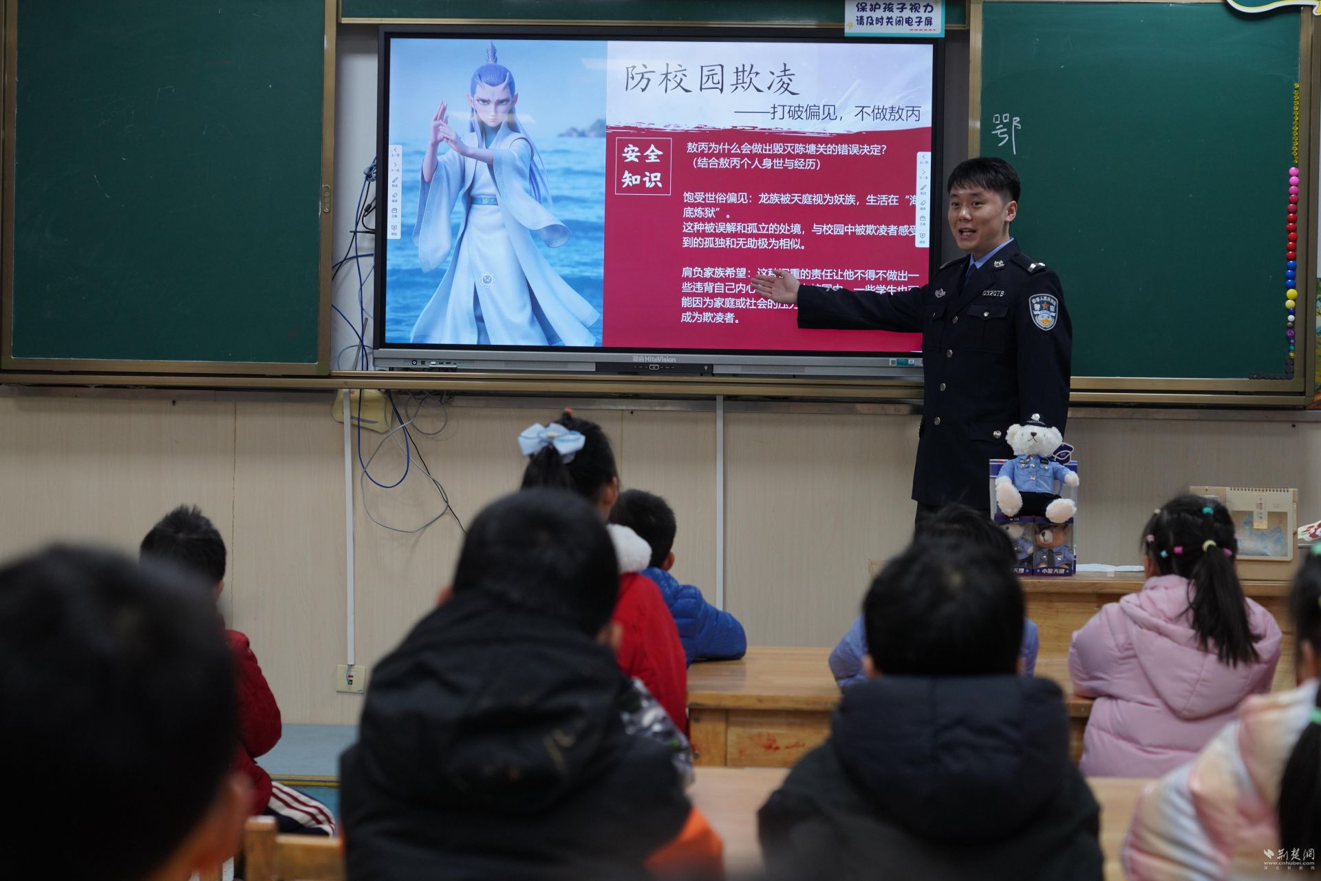 13日一大早,楊園街派出所武婭瑄和白沙所民警鄂靖來到武昌區中華路小學(橡樹灣校區)一年級10班,為40多名小學生帶來“乾坤圈里護平安 風火輪上闖難關”的“開學第一課”。
