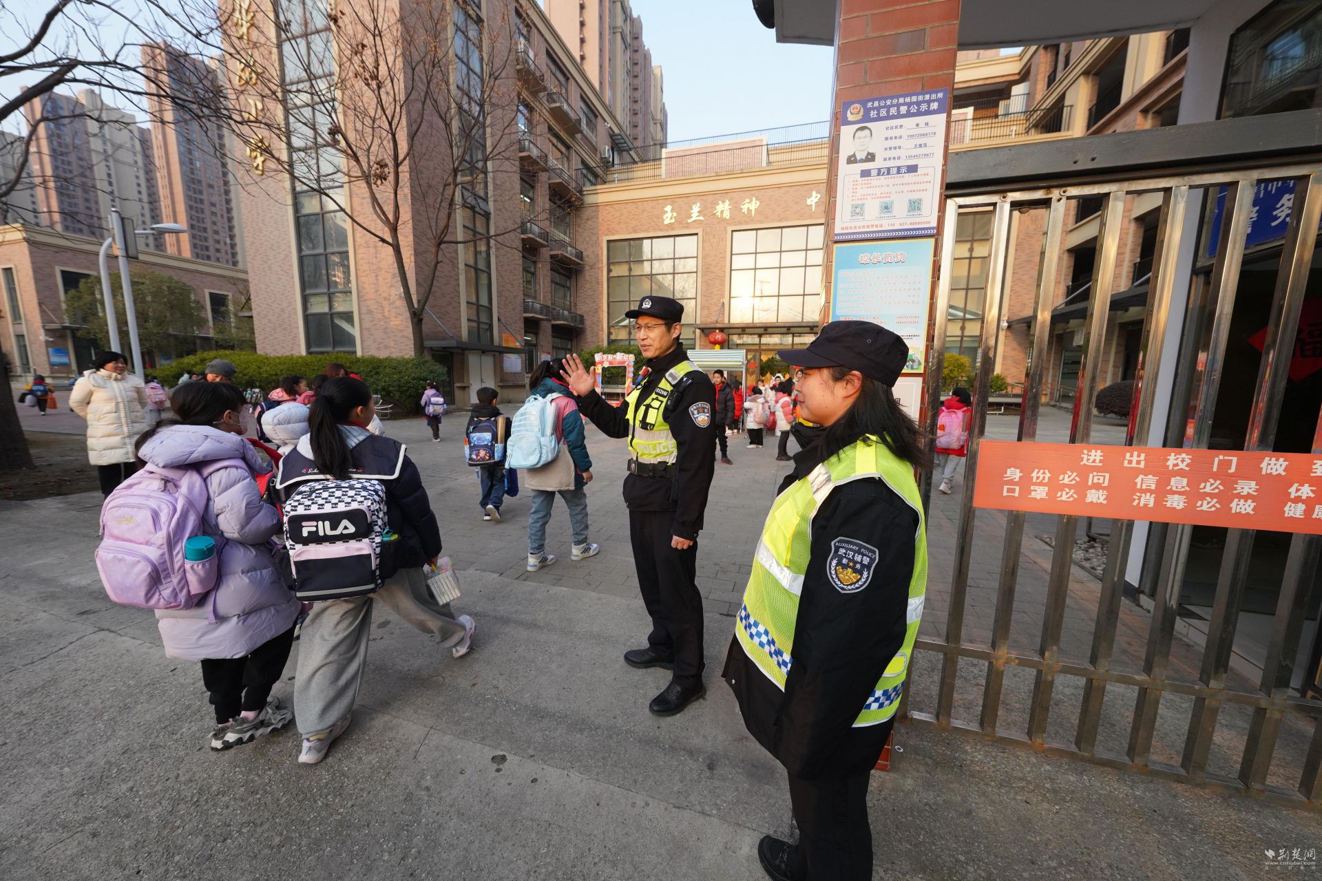 “警察阿姨,早上好。”在武昌省實驗小學門口,黃鶴樓所民警郭曉丹帶著黃鶴衛士迎接每一個上學的小朋友,收到不少小學生的致敬。“小朋友,新年好。”楊園所民警章銘在中華路小學橡樹灣門口熱情回應向他敬禮的小學生,這也是他連續第5年守護春季開學了。