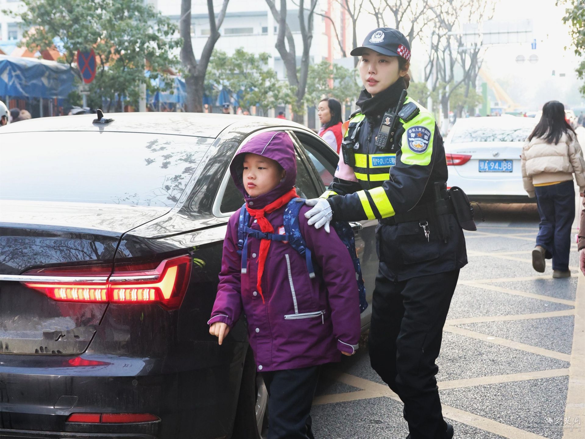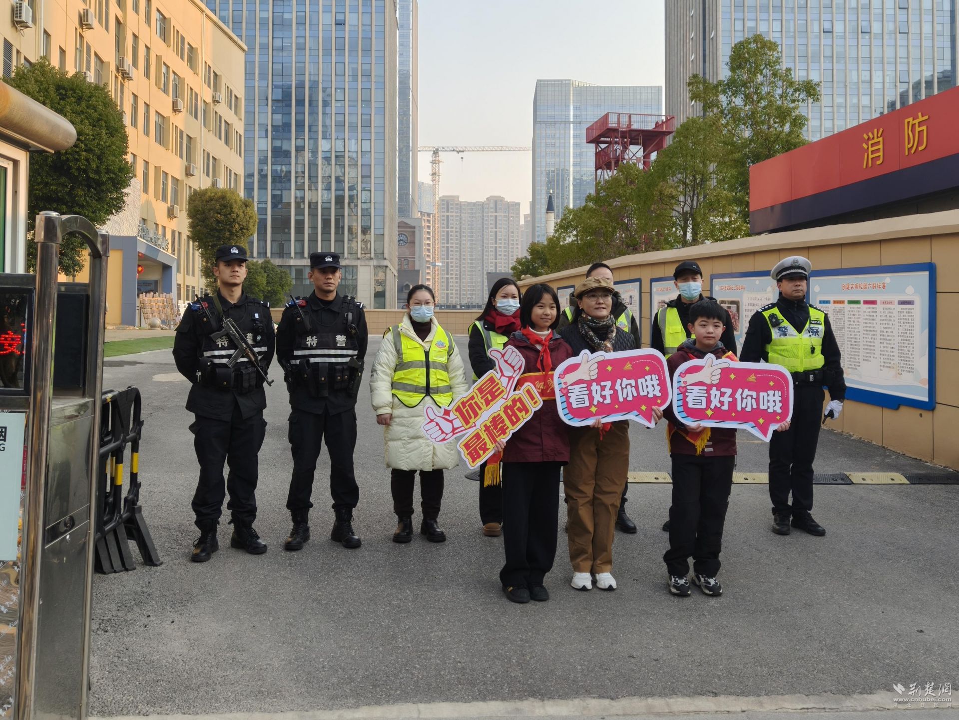 特警1102駐巡小組于7時30分準時抵達白鷺街小學門口。特警隊員站在路中央,雙手平舉攔住車流,大聲喊道:“同學們,排好隊,跟著老師走,注意安全!”在他們的引導下,孩子們在老師帶領下有序入校,路過時紛紛向他們敬禮致謝:“警察叔叔,您是我們的‘安全超人’!”開學首日,武漢特警加強校園周邊巡邏防控,提高見警率,隨時應對突發情況,為校園安全筑牢防線。