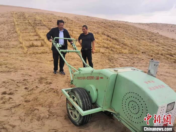 圖為甘肅省林草部門工作人員在測試研發的壓沙機。(甘肅省林業和草原局供圖)