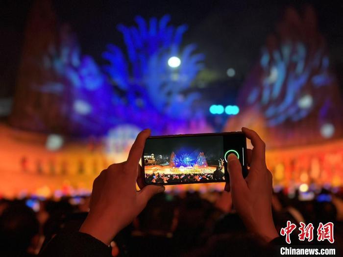 2月11日,甘肅文縣,《古韻文州·白馬新篇》上演,由當地白馬人演繹。圖為觀眾記錄現場。中新社記者 閆姣 攝