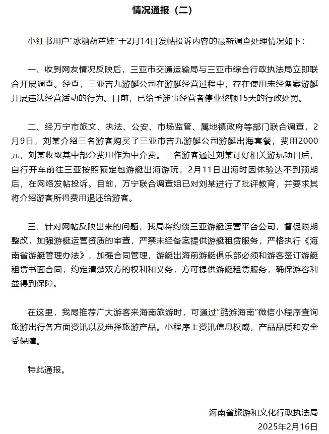 二、經萬寧市旅文、執法、公安、市場監管、屬地鎮政府等部門聯合調查,2月9日,劉某介紹三名游客購買了三亞市吉九游艇公司游艇出海套餐,費用2000元,劉某收取其中部分費用作為中介費。三名游客通過劉某訂好相關游玩項目后,自行開車前往三亞按照預定包游艇出海游玩,2月11日出海時因體驗達不到預期后,在網絡發帖投訴。目前,萬寧聯合調查組已對劉某進行了批評教育,并要求其將介紹游客所得費用退還給游客。