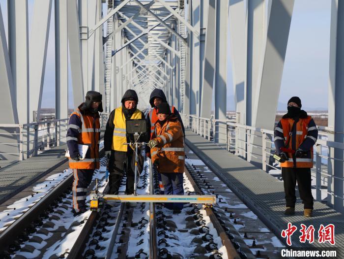 “這座大橋是四線套軌,既有俄羅斯1520毫米的寬軌,又有咱中國(guó)1435毫米的標(biāo)軌,我們都叫它‘騎馬線’?!?月17日,中國(guó)鐵路哈爾濱集團(tuán)公司佳木斯工務(wù)段同江線路車(chē)間技術(shù)員萬(wàn)廣峰提高了嗓門(mén)與身邊的工友們交流著,好讓聲音蓋過(guò)呼嘯的風(fēng)聲。工友們一邊呵著白氣,一邊聚精會(huì)神地聽(tīng)著,時(shí)不時(shí)點(diǎn)頭。凜冽的寒風(fēng)如刀子般刮過(guò),這群年輕的工友站在大橋上。